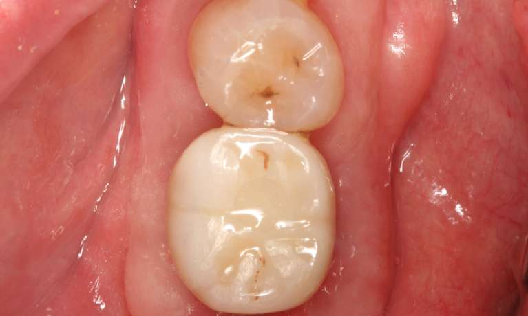 The tooth was removed and a bone graft was placed in the site. Once healed the gap was replaced with a titanium implant and natural like looking implant crown. The crown is screwed to the implant with a small screw and screw channel is sealed with a white colour filling.