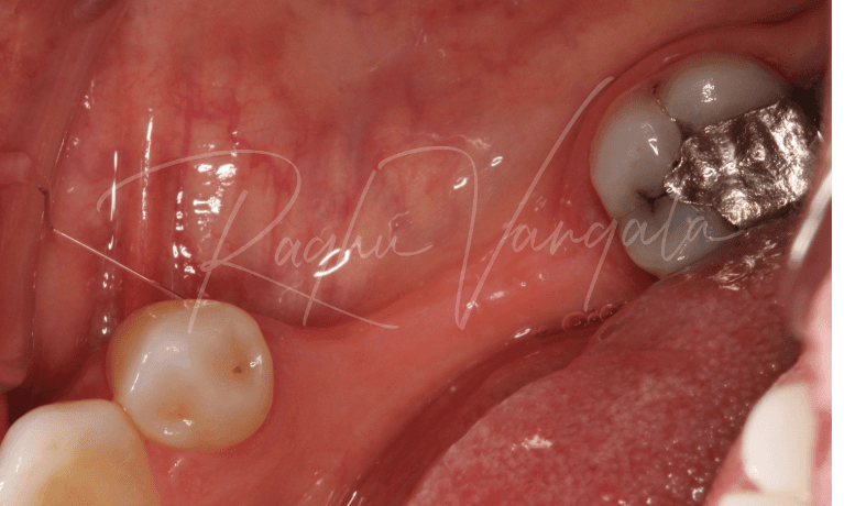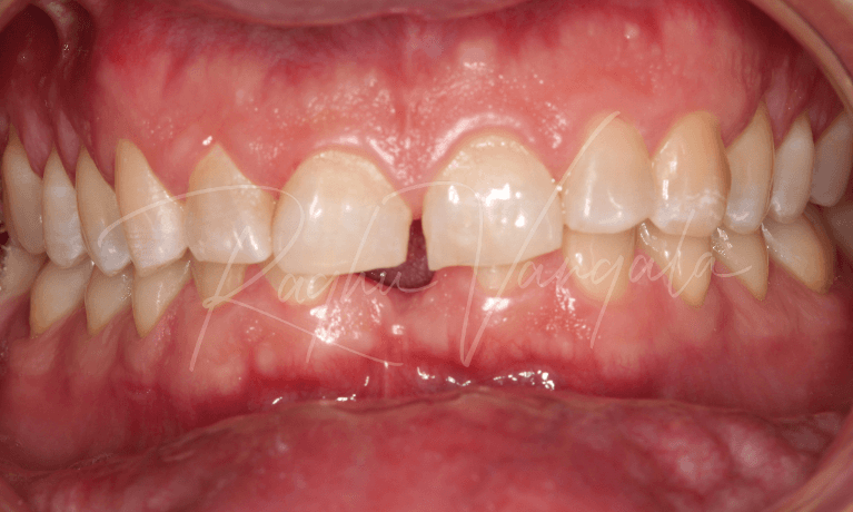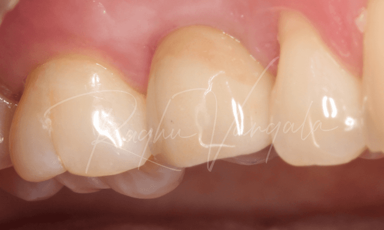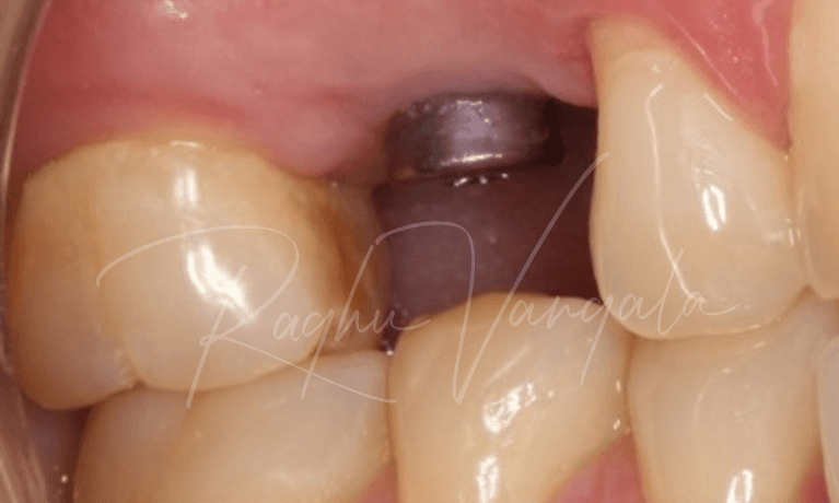This beautiful lady came to us after a terrible accident that had let her top front left tooth fractured. She had seen her local dentist right after the incident who helped her with a temporary filling. The patient was still in a lot of pain and it presented in a very poor condition so Dr Raghu removed the tooth and placed a bone graft in the site to prepare for an implant. A denture with the missing tooth was made so that the patient could it wear while the extraction site healed.