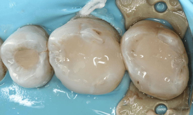 Sometimes, it's understandable. When multiple silver fillings need to be replaced (they are breaking down and causing cracks in teeth), the patient chooses to get them fixed in one appointment. This we call "Quadrant Dentistry". Here, Under Rubberdam ( to prevent swallowing silver fillings and vapour while removing ), we had to replace old silver fillings, treat the decay, and then restore with a filling and custom-made, computer-designed, and milled restoration/fillings. This is a combination of direct and indirect fillings.
