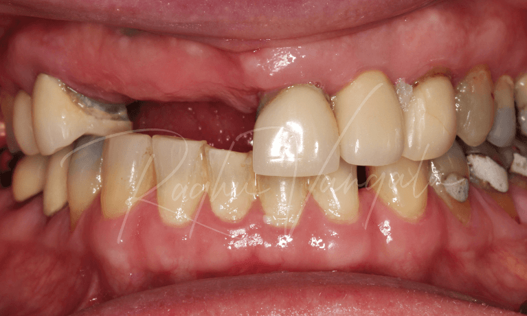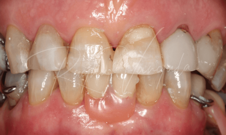 This case reflects our commitment to excellence for over a decade. This patient had issues with his upper front teeth. He lost one of his upper front teeth, and the adjacent tooth developed infection.