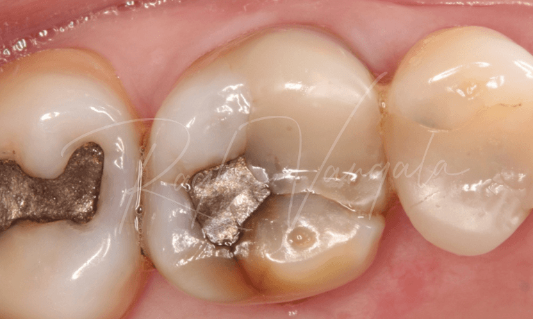 This tooth had experienced multiple cracks in it, so we used a computer designed and hand crafted porcelain cap while preserving as much tooth structure as possible. We call this Onlay. It's done using a rubberdam to prevent inhalation of old silver filling into your system.