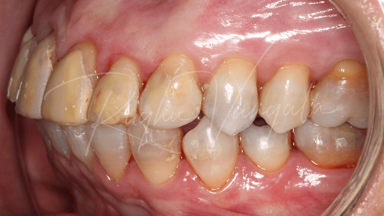 This charming lady initially came to us unhappy with her central incisor (front teeth) veneers and the way they were discolouring, and had 25 and 26 (top premolar and molar) extracted that left a big gap in her mouth. She had also worn down some of her lower teeth, and Dr Raghu explained that it will only keep getting worse over time.