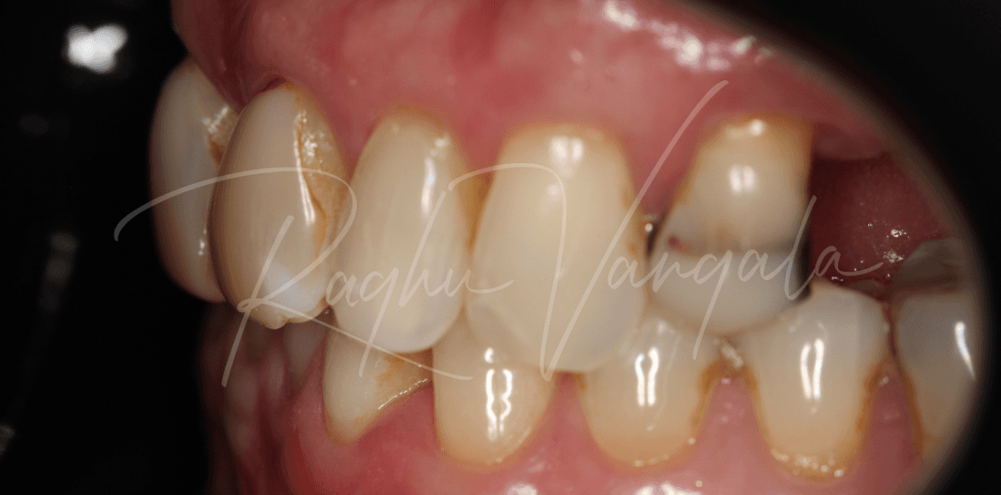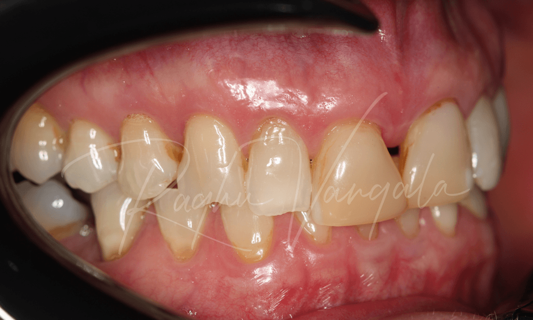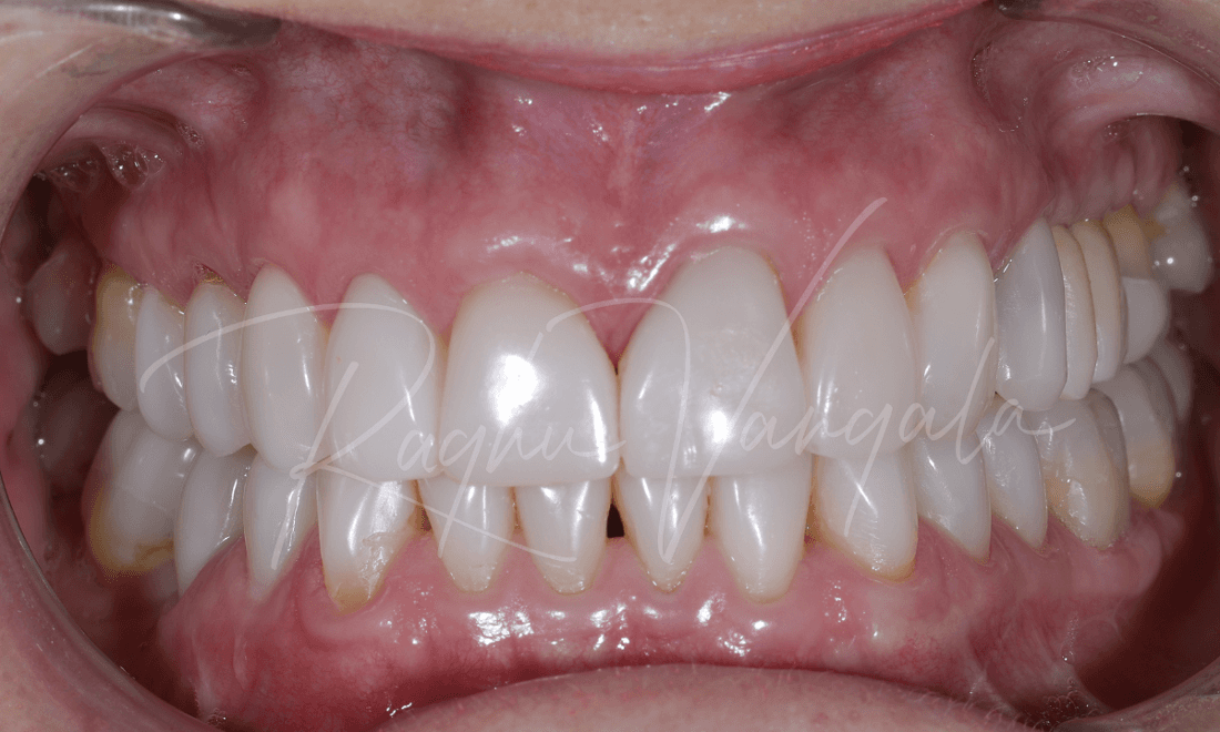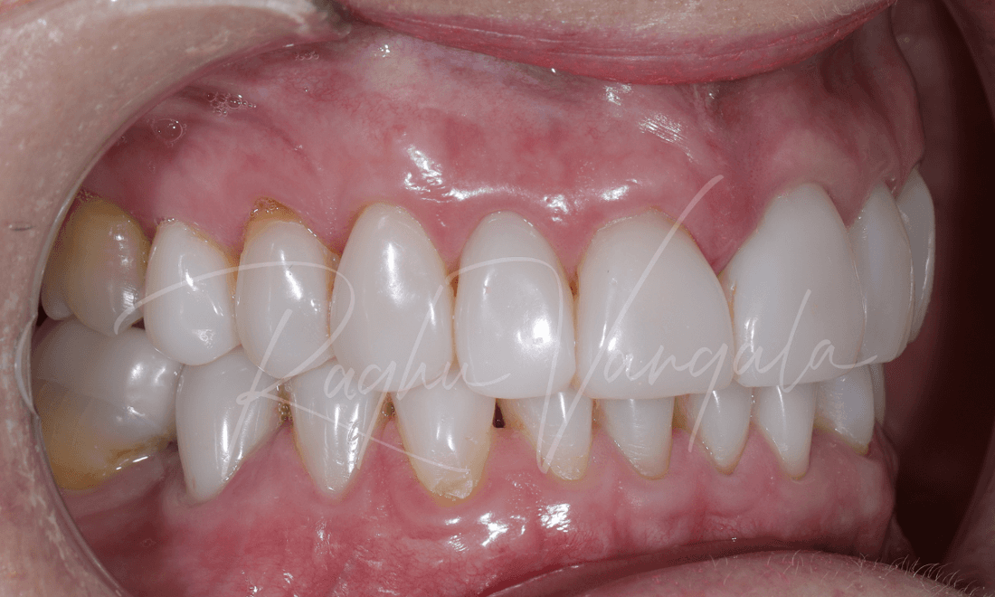 This charming lady initially came to us unhappy with her central incisor (front teeth) veneers and the way they were discolouring, and had 25 and 26 (top premolar and molar) extracted that left a big gap in her mouth. She had also worn down some of her lower teeth, and Dr Raghu explained that it will only keep getting worse over time.